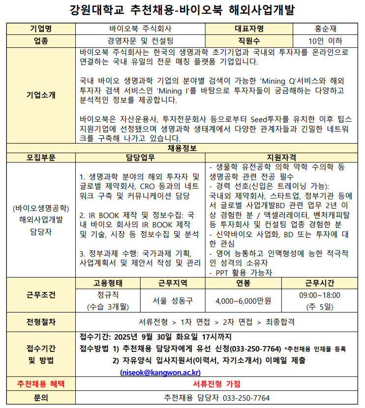 1. 바이오북에서 강원대학교 졸업생 및 졸업예정자를 대상으로 추천채용을 진행합니다.