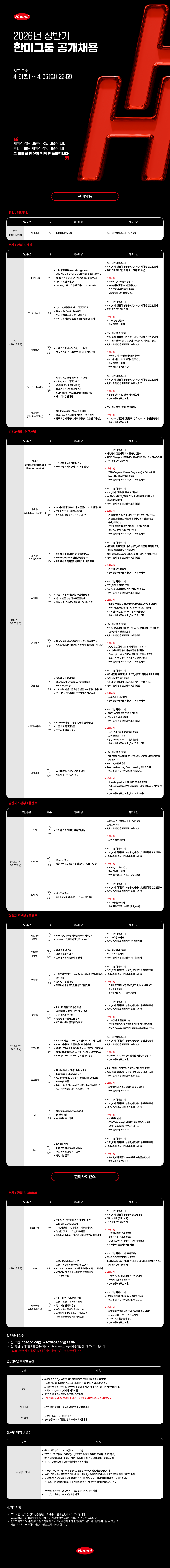 | '2026년 상반기 한미그룹 공개채용 - 한미약품/한미사이언스' 채용공고 안내드립니다. | |||||||||||